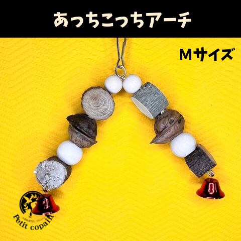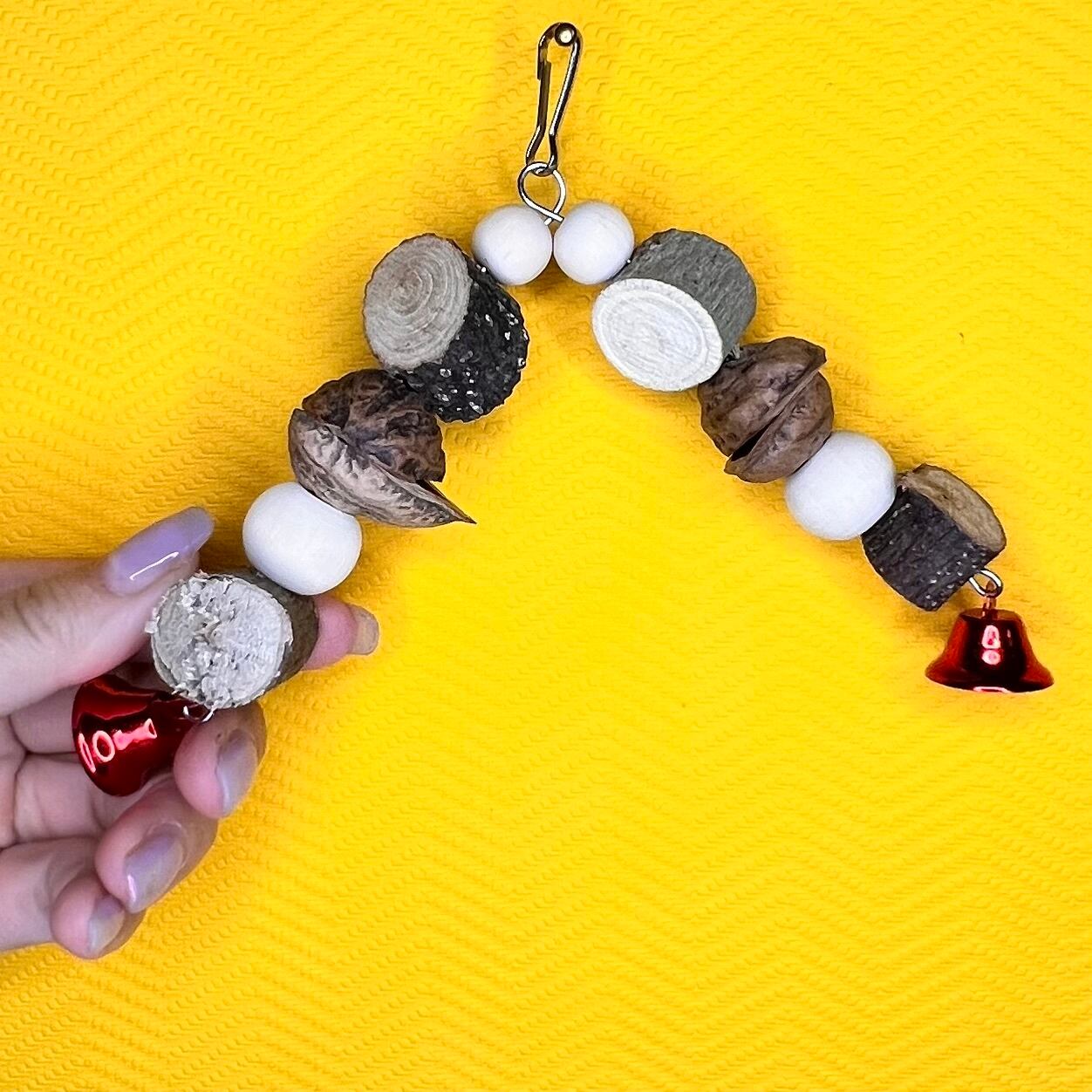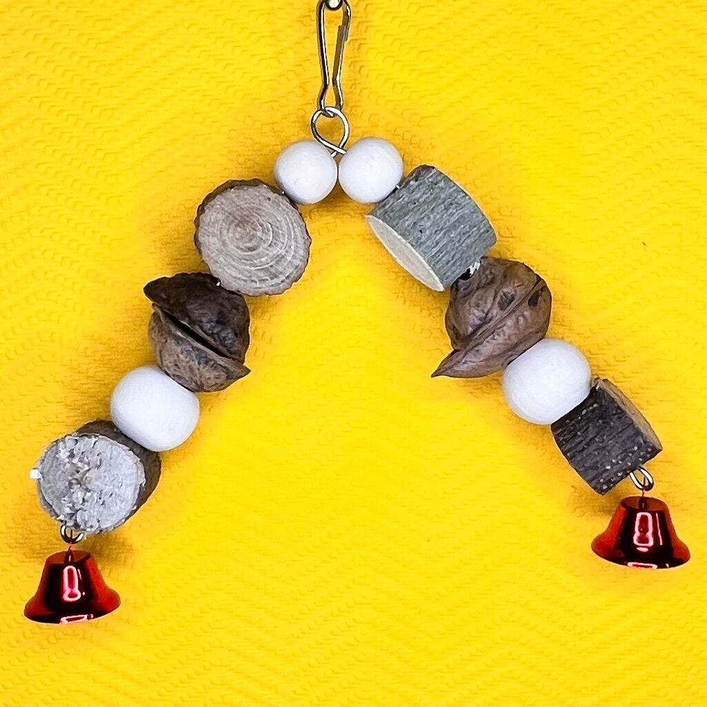 天然木と自然素材を丈夫なステンレスワイヤーで通し両端にキラキラゆらゆら揺れるベルが付いていて鳥さんの好奇心を刺激します!