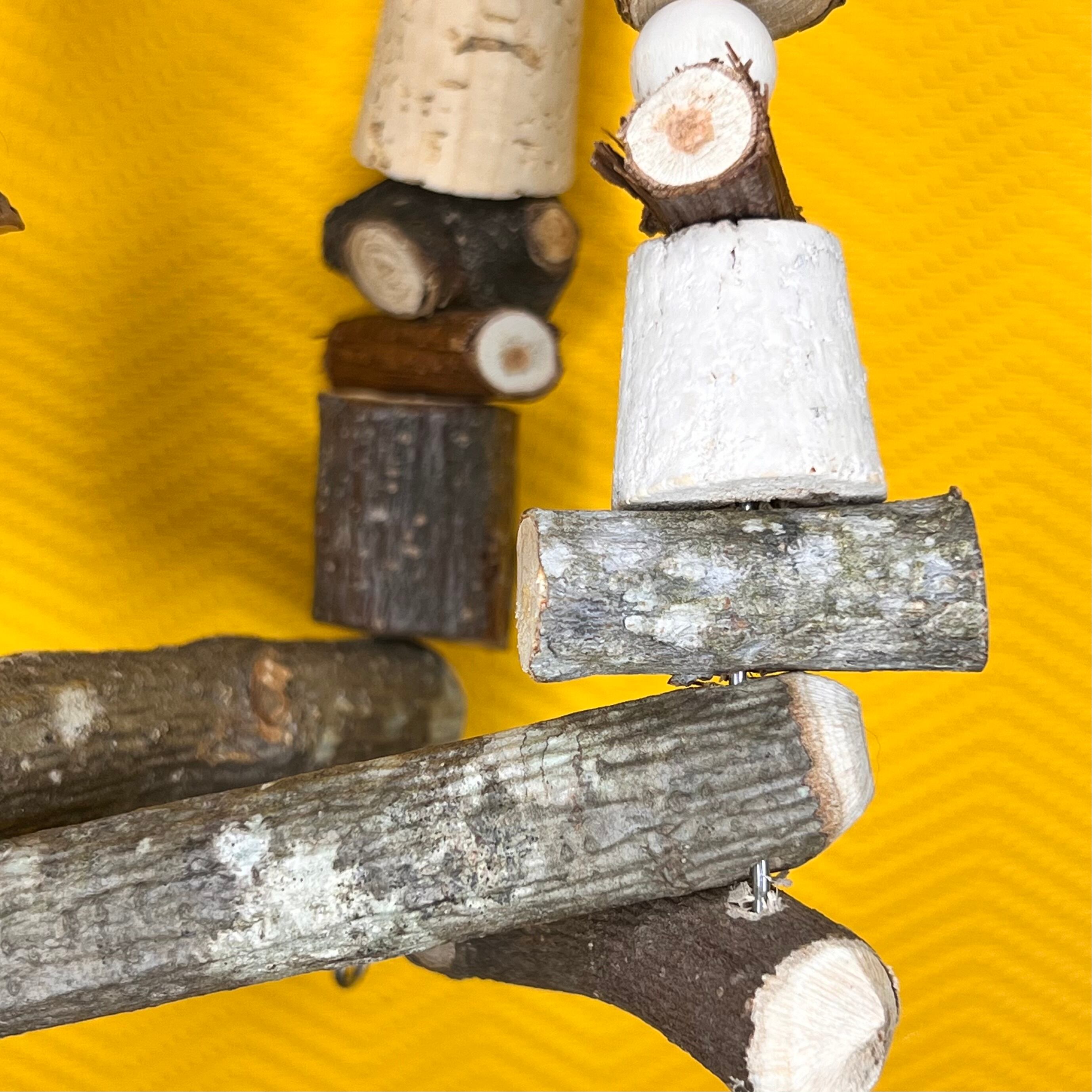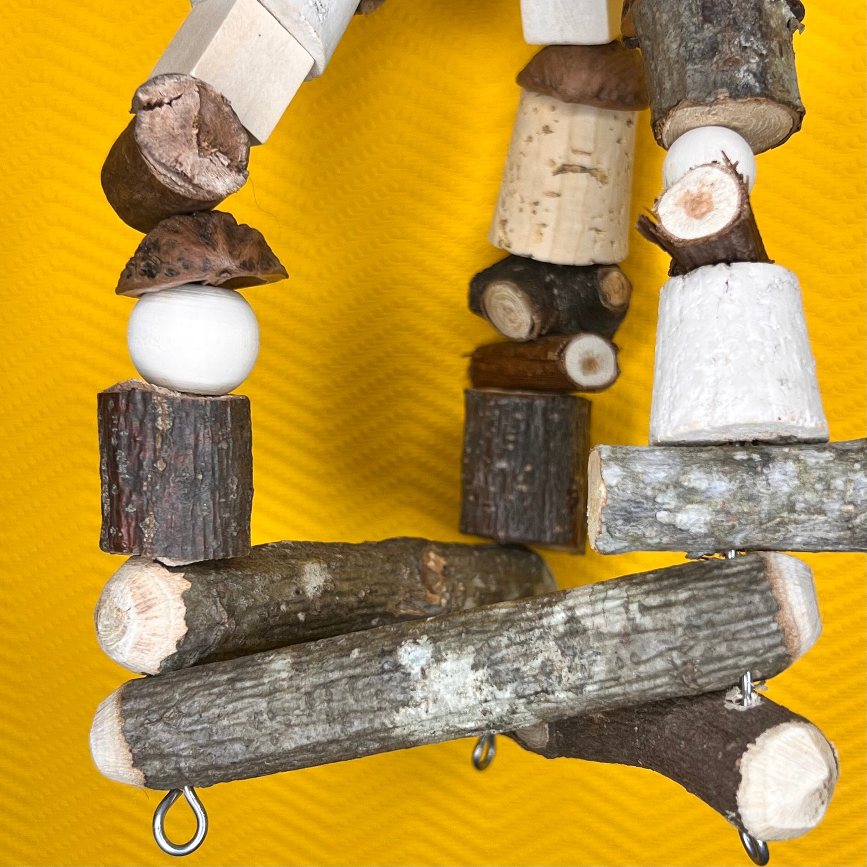 クルミの殻・天然木・ステンレス留め具・麻紐・トウモロコシの皮・ヤシの実の殻など