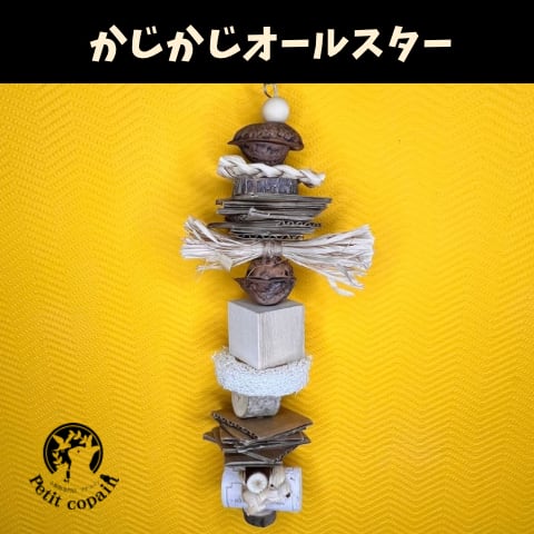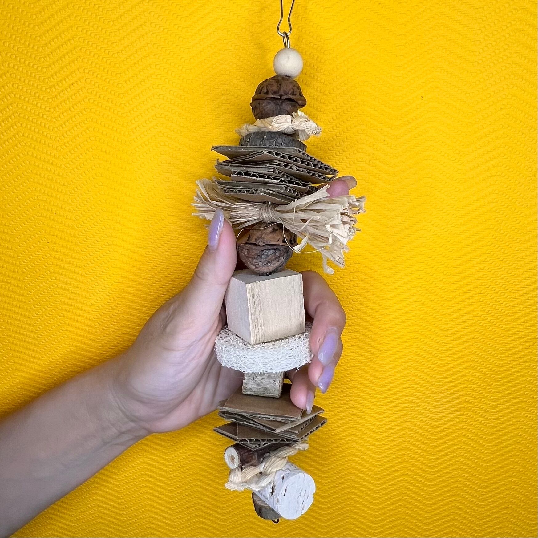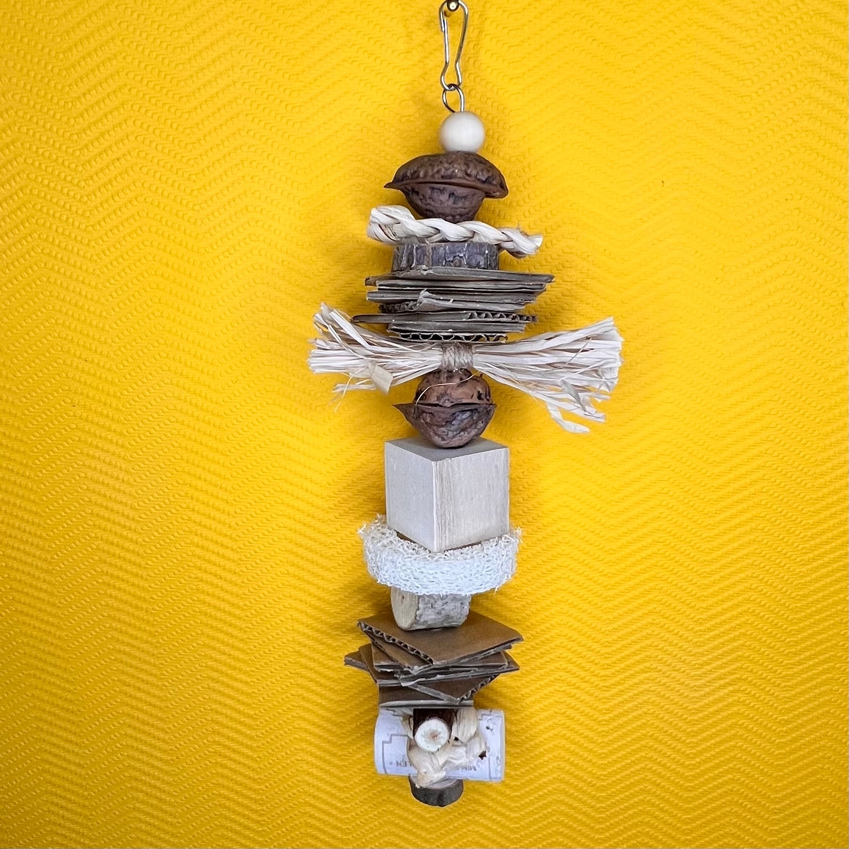 そんな欲張りな鳥さんに満足して貰いたい!という想いで当店の素材を豪快に全部のせしたおもちゃです。