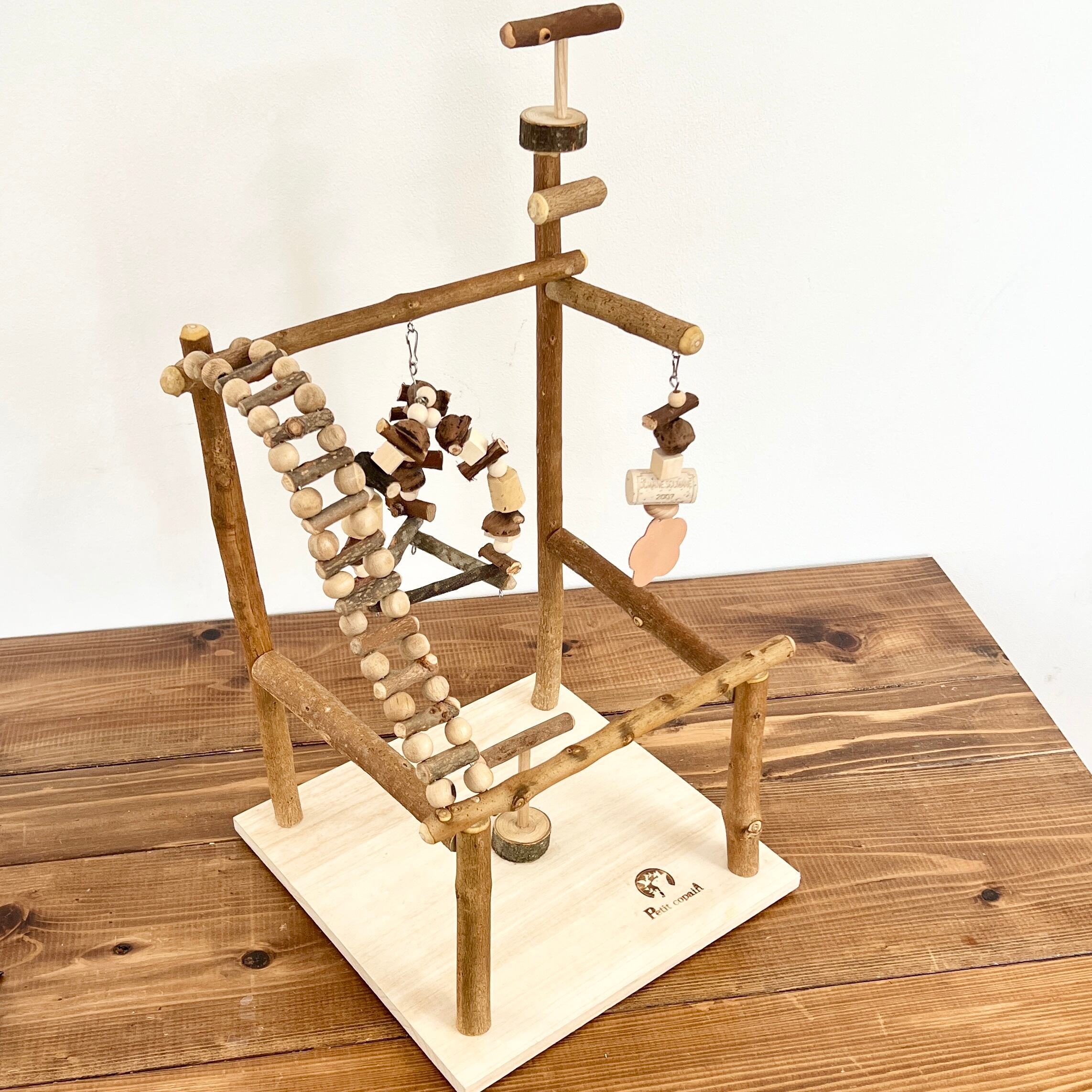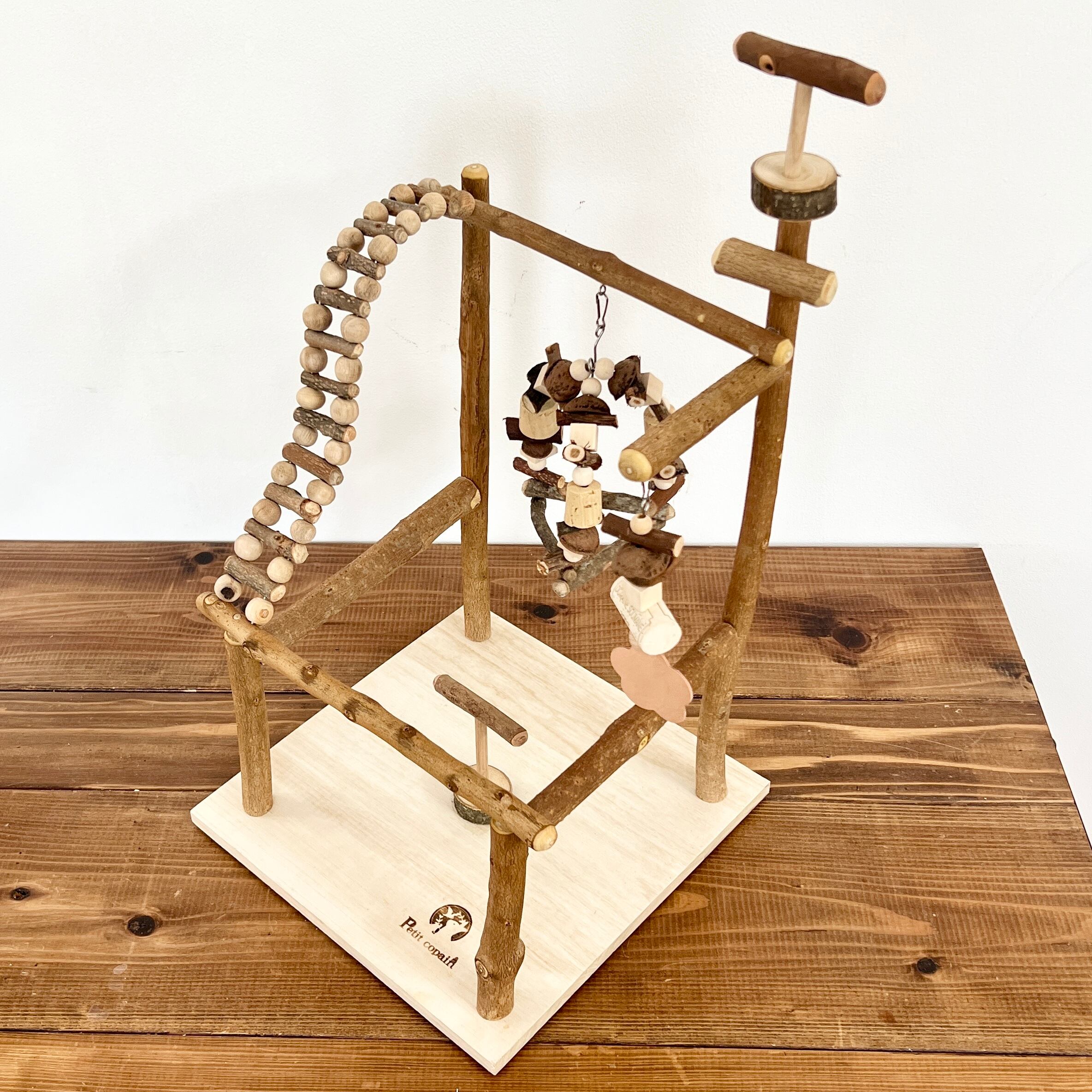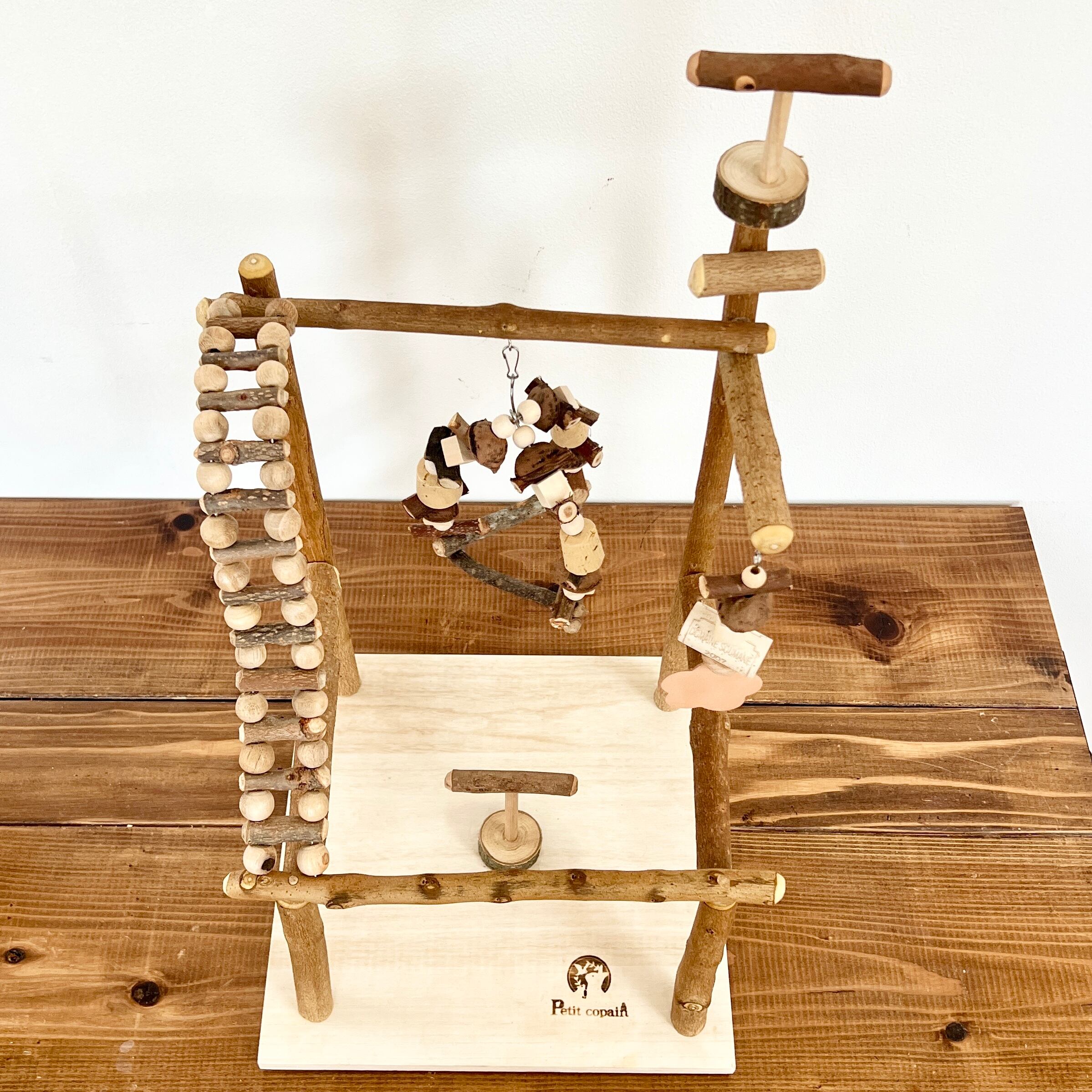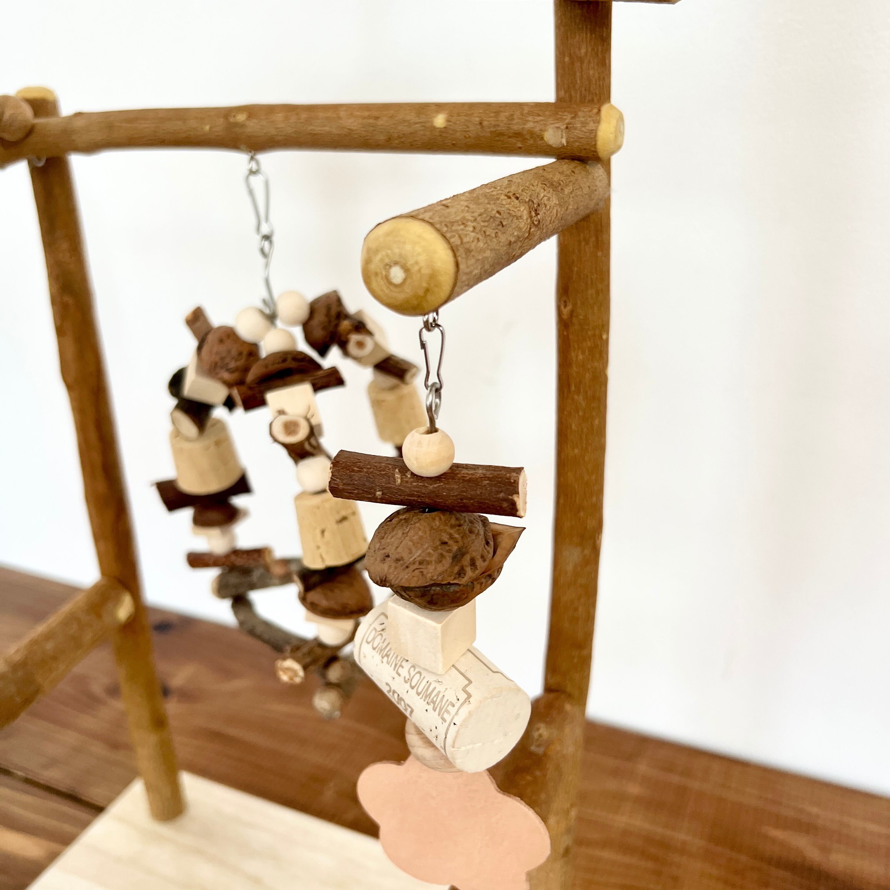 - 素材: 台座は桐材・本体は国産木材(栗・柿・楢など)・ブランコ留め金具(ステンレス)