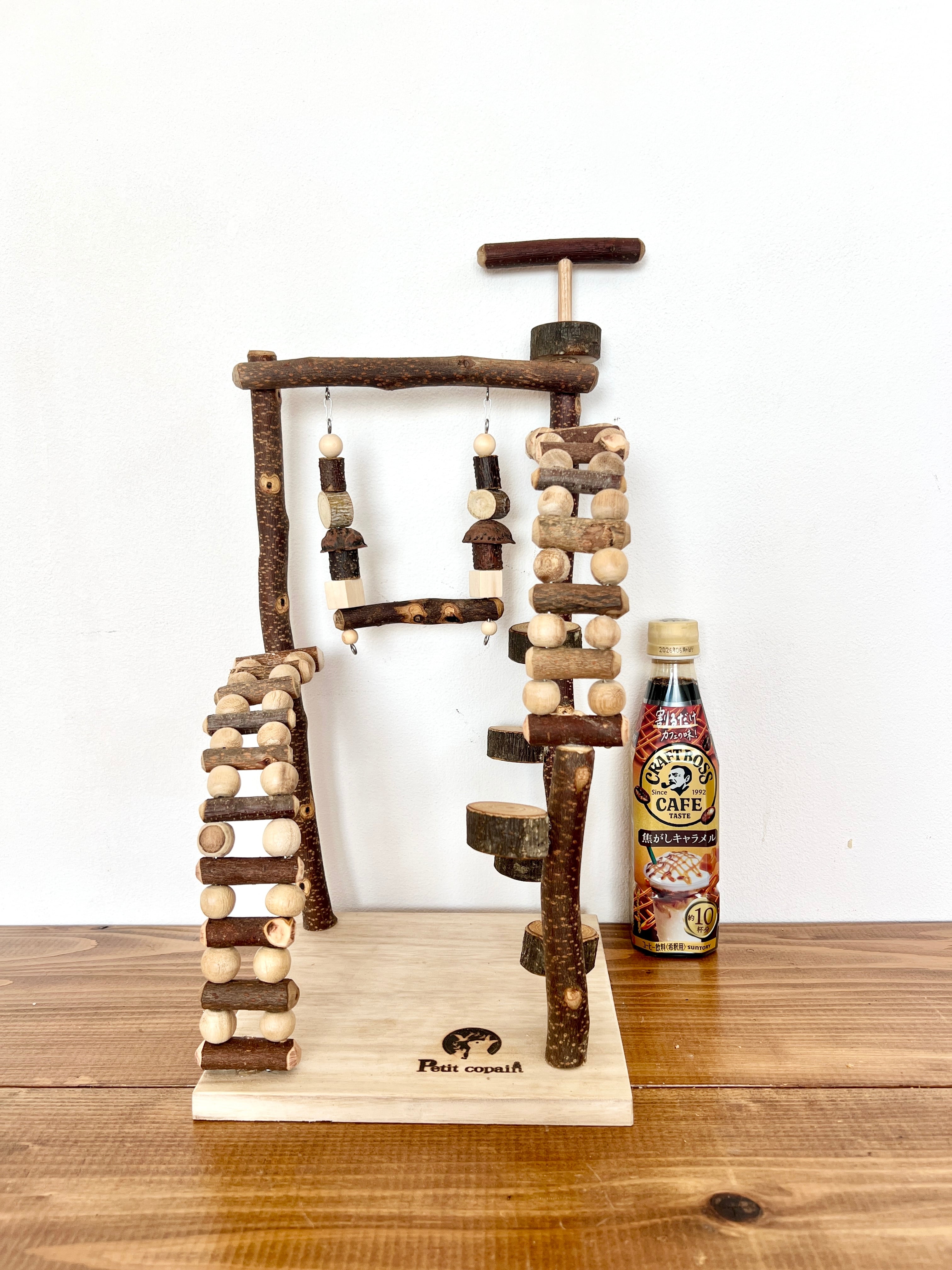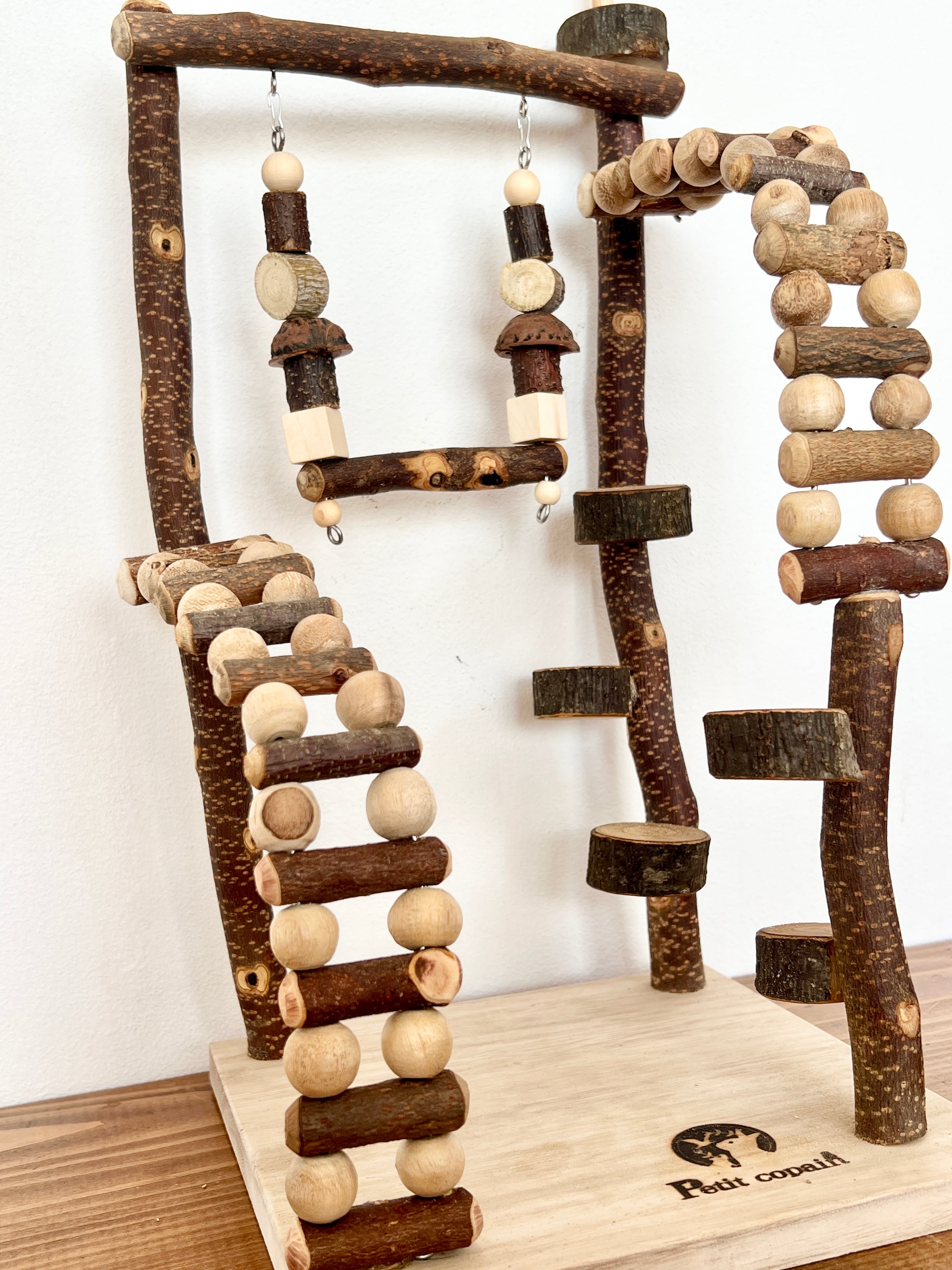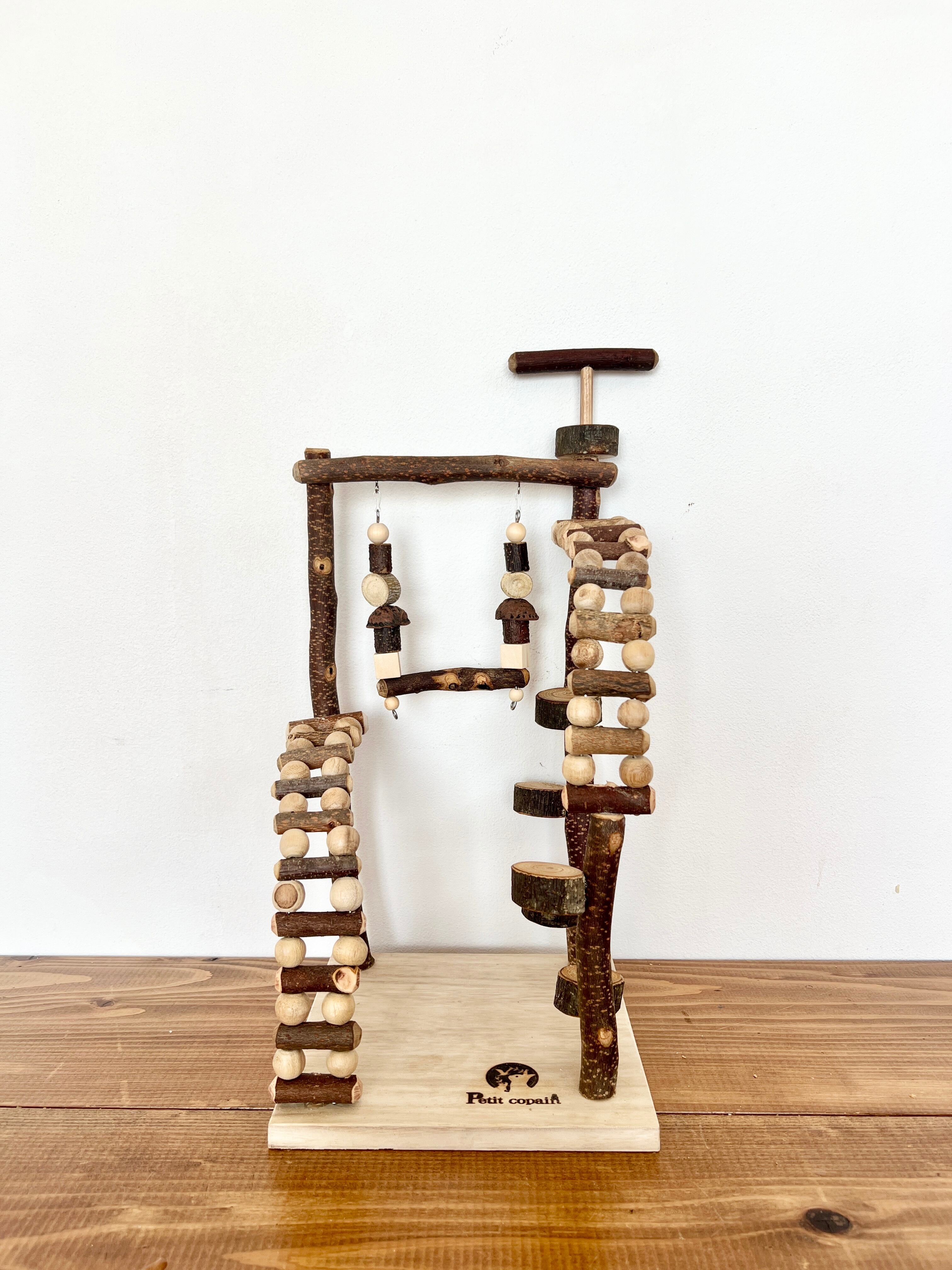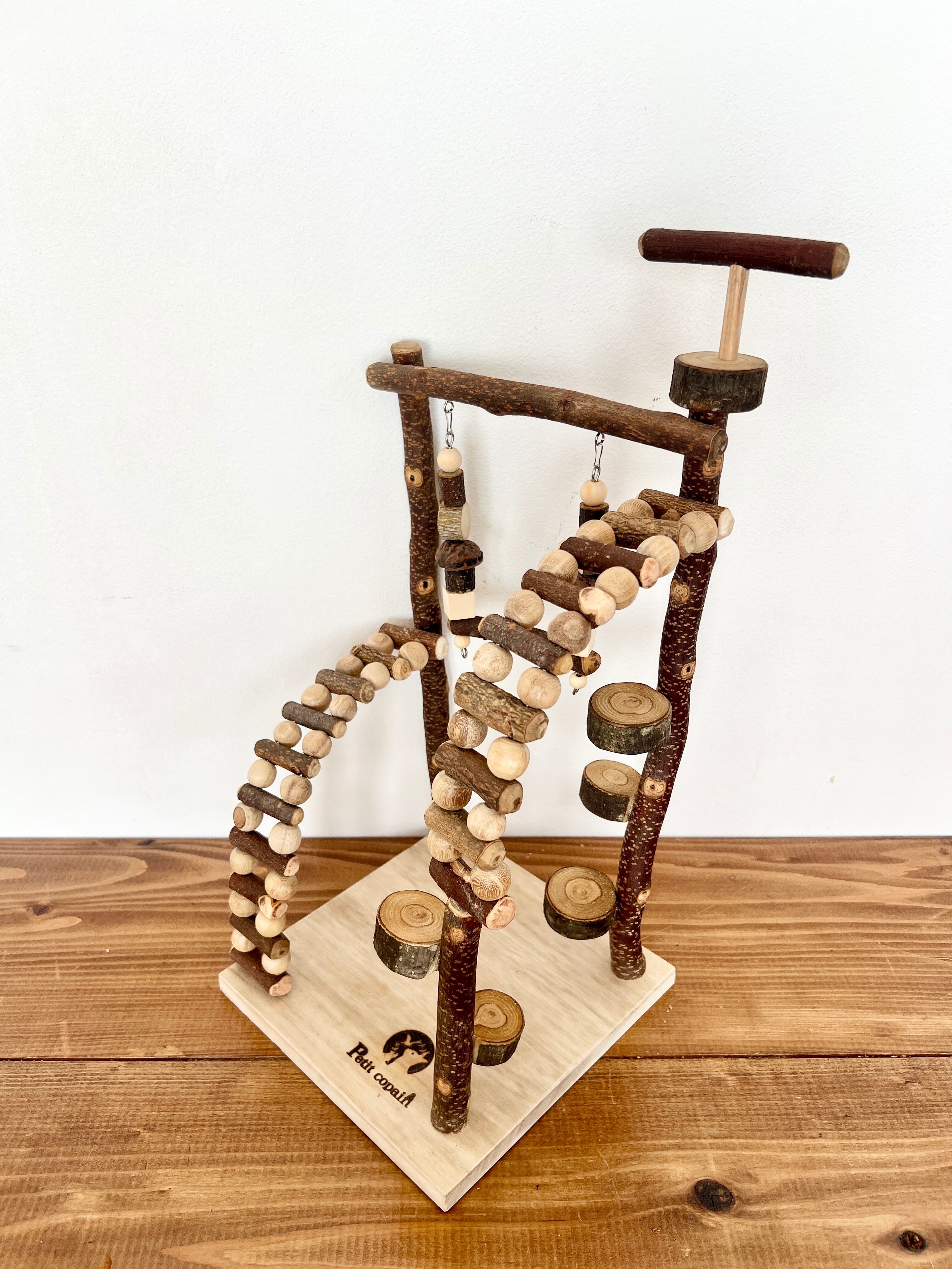 天然素材を使っているので鳥さんの足にも良くおもちゃやブランコで遊びながら楽しい放鳥タイムをおすごし下さい