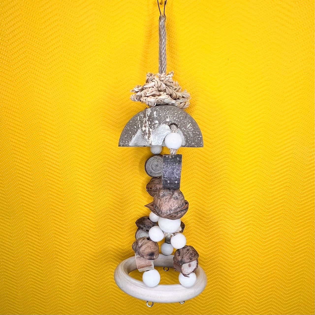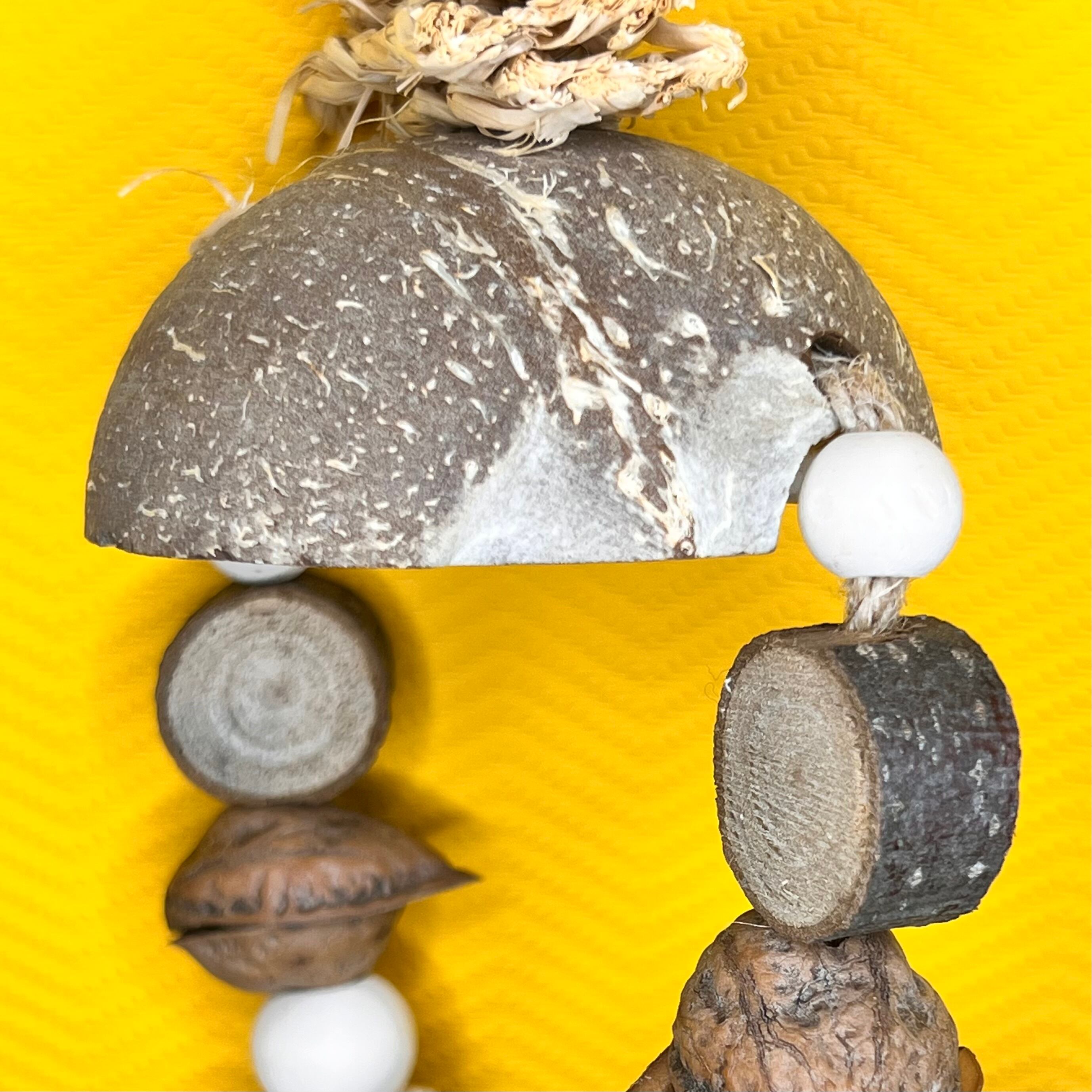 クルミの殻・天然木・ステンレス留め具・麻紐・トウモロコシの皮・ヤシの実の殻など