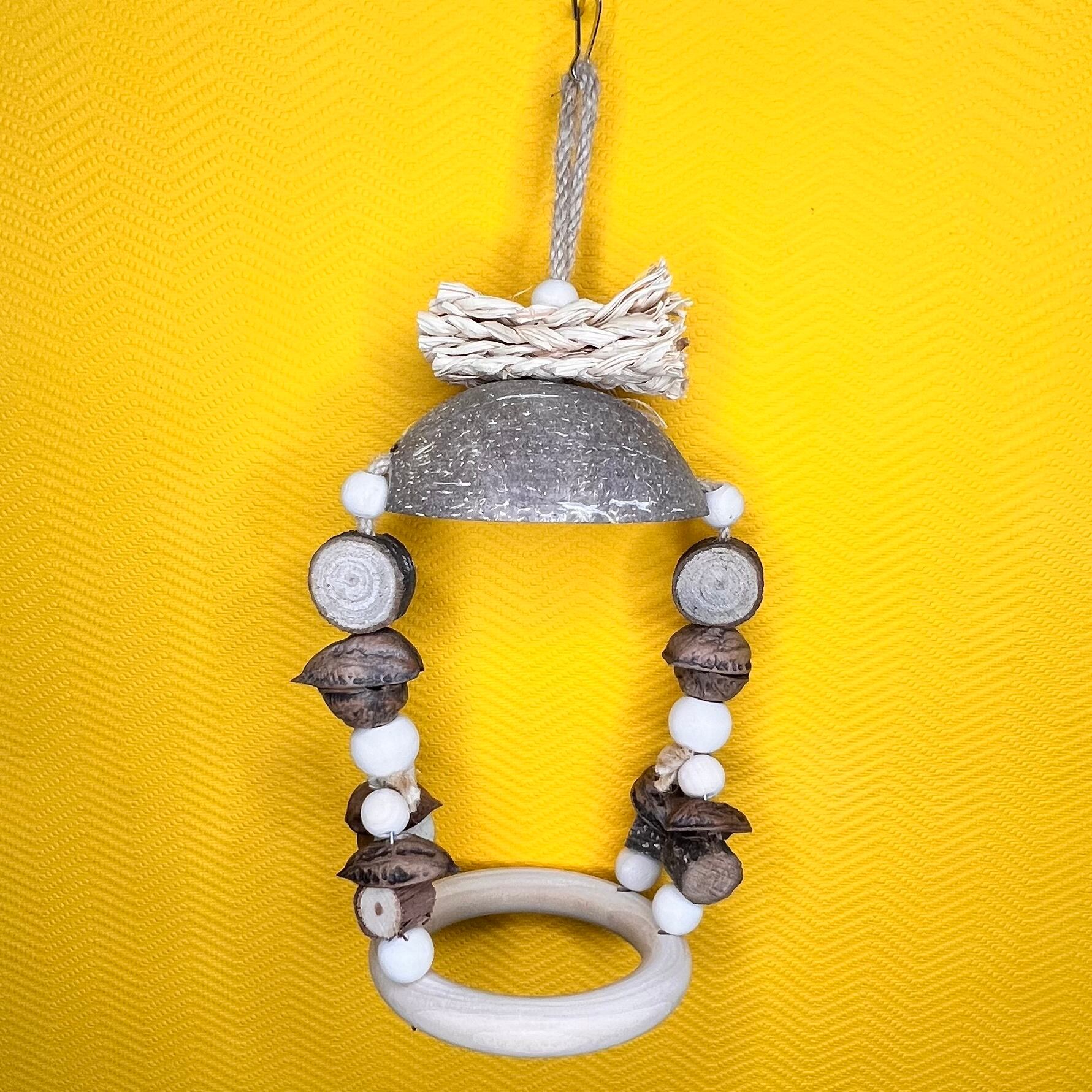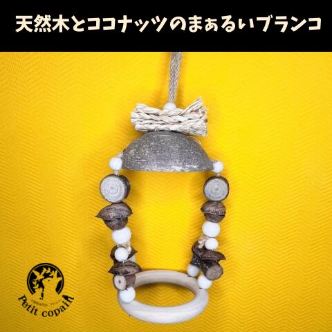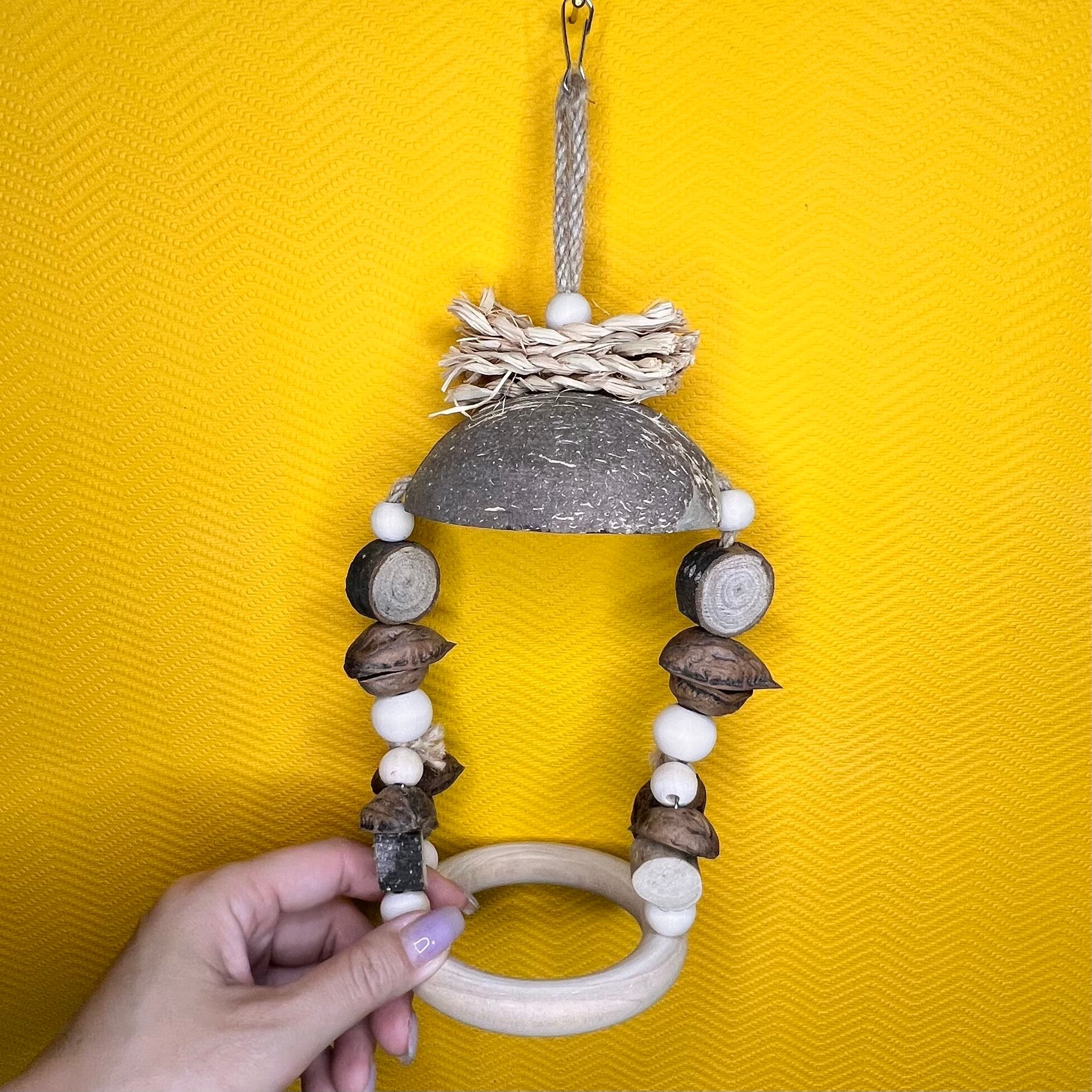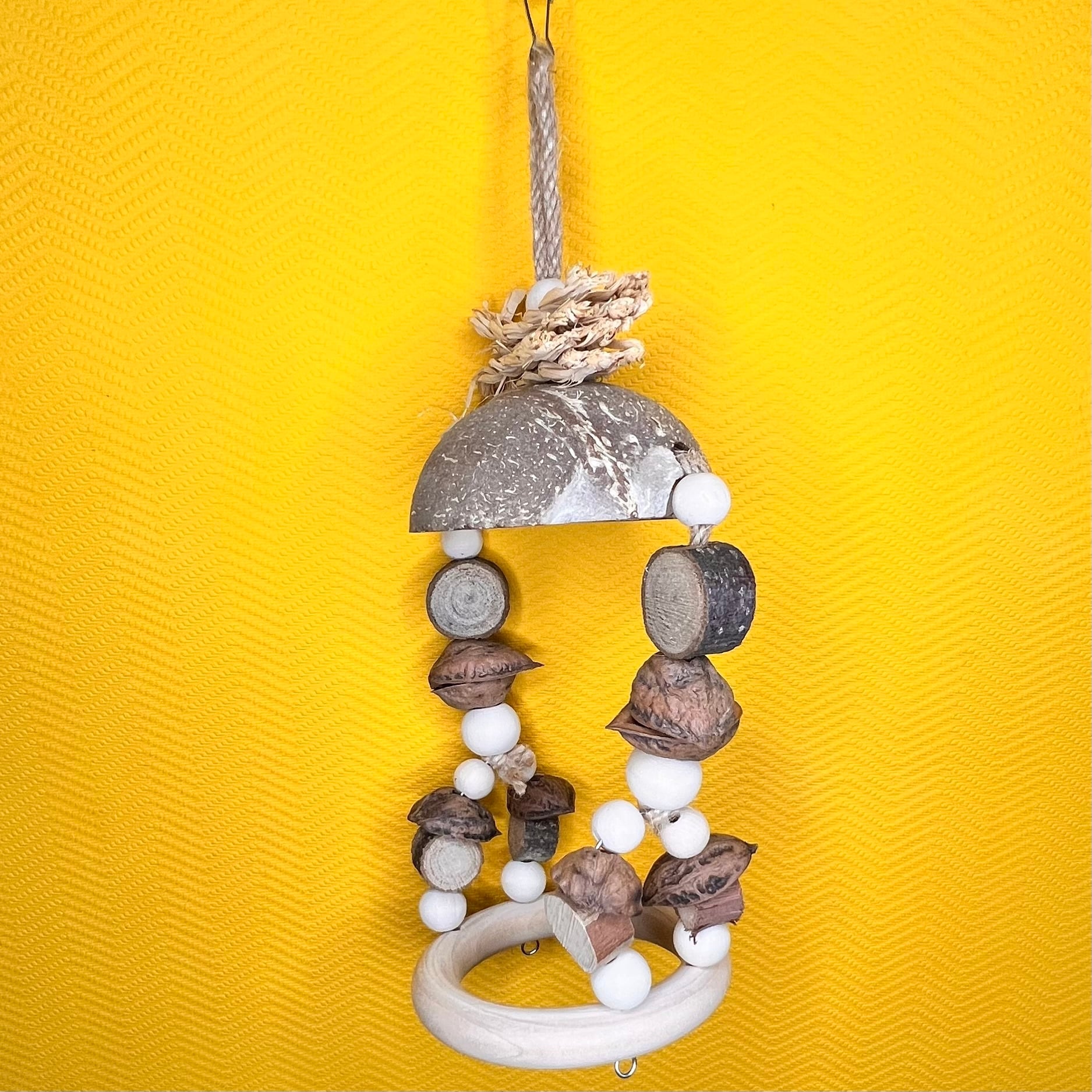 ヤシの実の屋根から天然素材がたくさん付いた麻紐にまるい止まり木がついた南国感いっぱいの可愛いブランコです!!