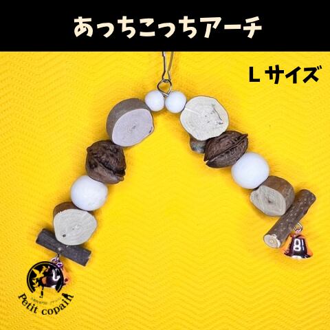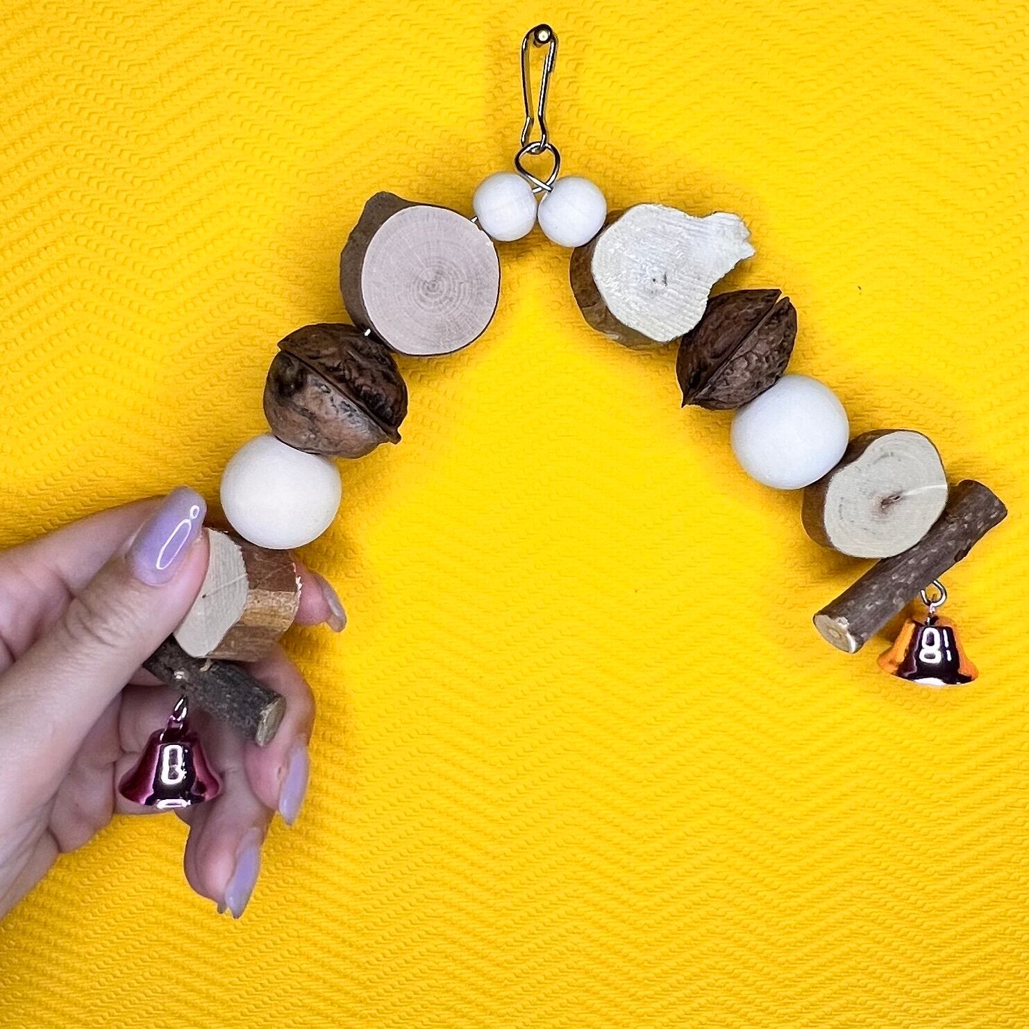 天然木と自然素材を丈夫なステンレスワイヤーで通し両端にキラキラゆらゆら揺れるベルが付いていて鳥さんの好奇心を刺激します!